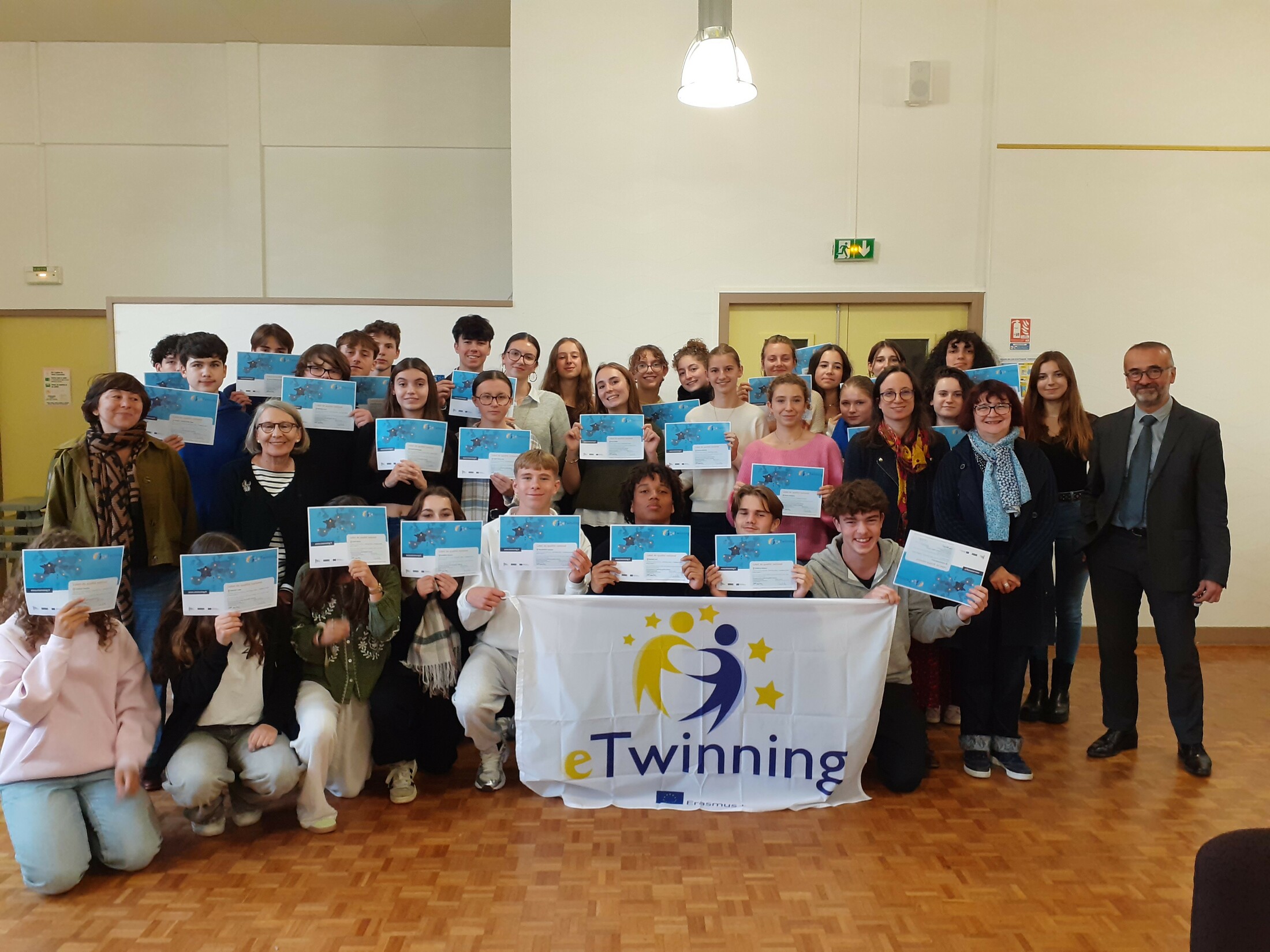 Ce vendredi 10 octobre 2025, Mme Courteille, responsable des projets eTwinning (projet collaboratif européen) est venue remettre aux élèves leur diplôme, symbole de leur investissement.Deux projets ont été récompensés par le label de qualité eTwinning :